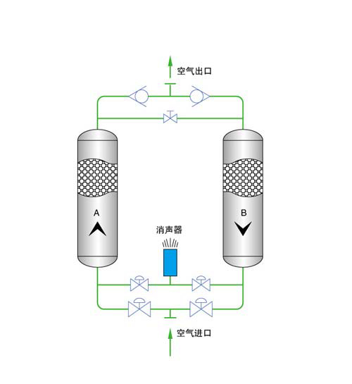 無(wú)熱再生空氣干燥器是根據(jù)變壓吸附原理,利用微孔狀干燥劑吸附水分子來(lái)干燥壓縮空氣的一種設(shè)備。