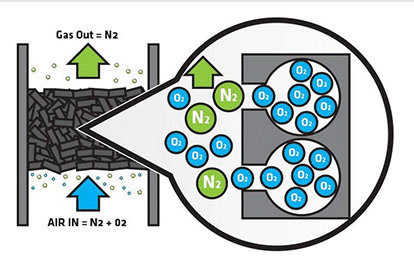 分子篩制氮機(jī)(PSA變壓吸附制氮機(jī))是以碳分子篩為吸附劑,利用壓縮空氣中氧、氮分子在碳分子篩中吸附量的差異,通過加壓吸附產(chǎn)氣,常壓脫附再生的原理從壓縮空氣中直接制取產(chǎn)品氮?dú)獾臍怏w分離設(shè)備。