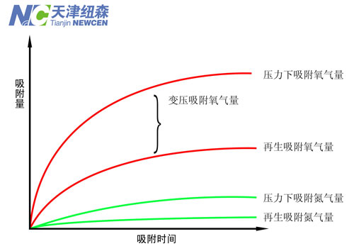 碳分子篩對(duì)氧氣和氮?dú)庠诓煌奈綍r(shí)間和吸附壓力下吸附量的變化差異曲線:在空氣壓力升高時(shí),碳分子篩將大量吸附氧氣、二氧化碳和水分。當(dāng)壓力降到常壓時(shí),碳分子篩對(duì)氧氣、二氧化碳和水分的吸附量較小