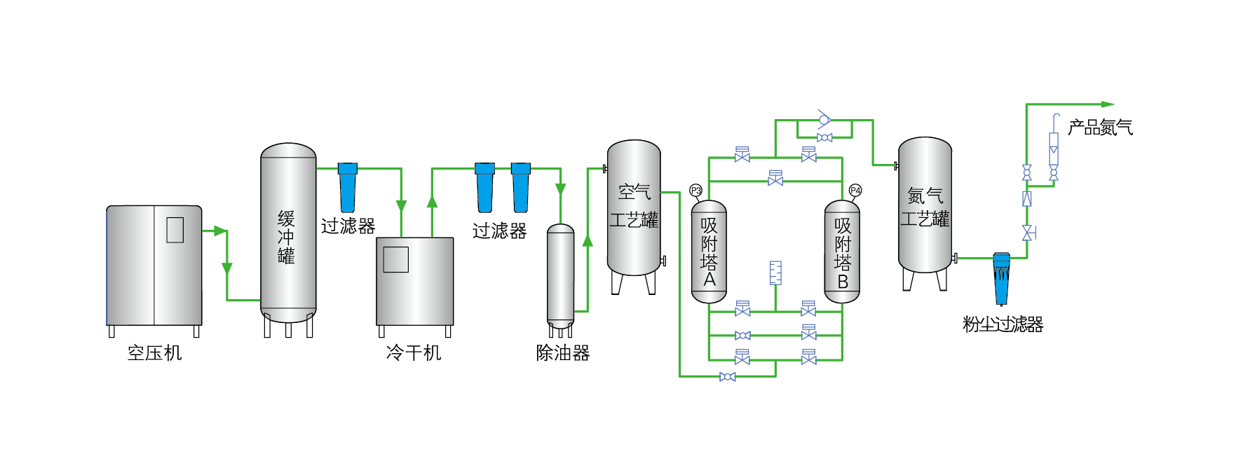 包括:螺桿空壓機(jī)、?W級(jí)氣水分離過濾器、空氣緩沖罐、7級(jí)過濾器、冷干機(jī)、5級(jí)過濾器、3級(jí)過濾器、活性炭除油器、空氣工藝罐、分子篩制氮機(jī)(PSA制氮機(jī))、氮?dú)鈾z測(cè)裝置、氮?dú)夤に嚬?、氮?dú)鈨?chǔ)罐等基本單元模塊。